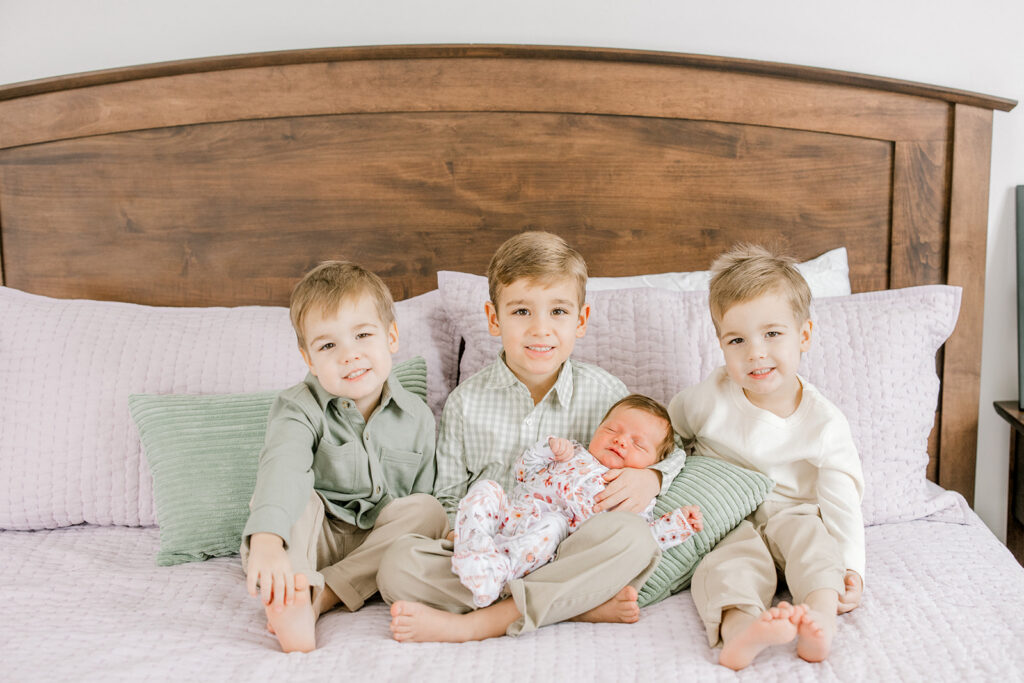There is something incredibly special about welcoming a baby girl into a home full of boys—and the Gallien family’s Zionsville newborn session was nothing short of joyful. After three energetic, camera-loving brothers, their first daughter, Emily, has officially arrived!