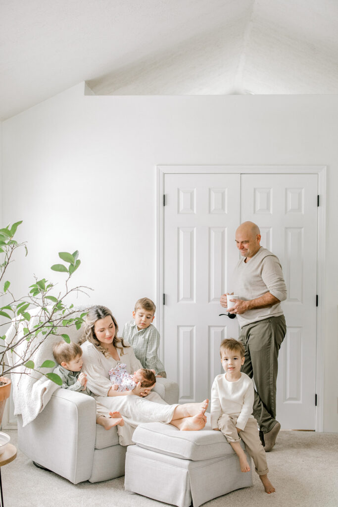 When I arrived at their Zionsville home, I’ll admit—sometimes walking into a session with multiple young kids can feel a little intimidating. As a newborn photographer, you never quite know how siblings will respond, especially with a brand-new baby in the mix.